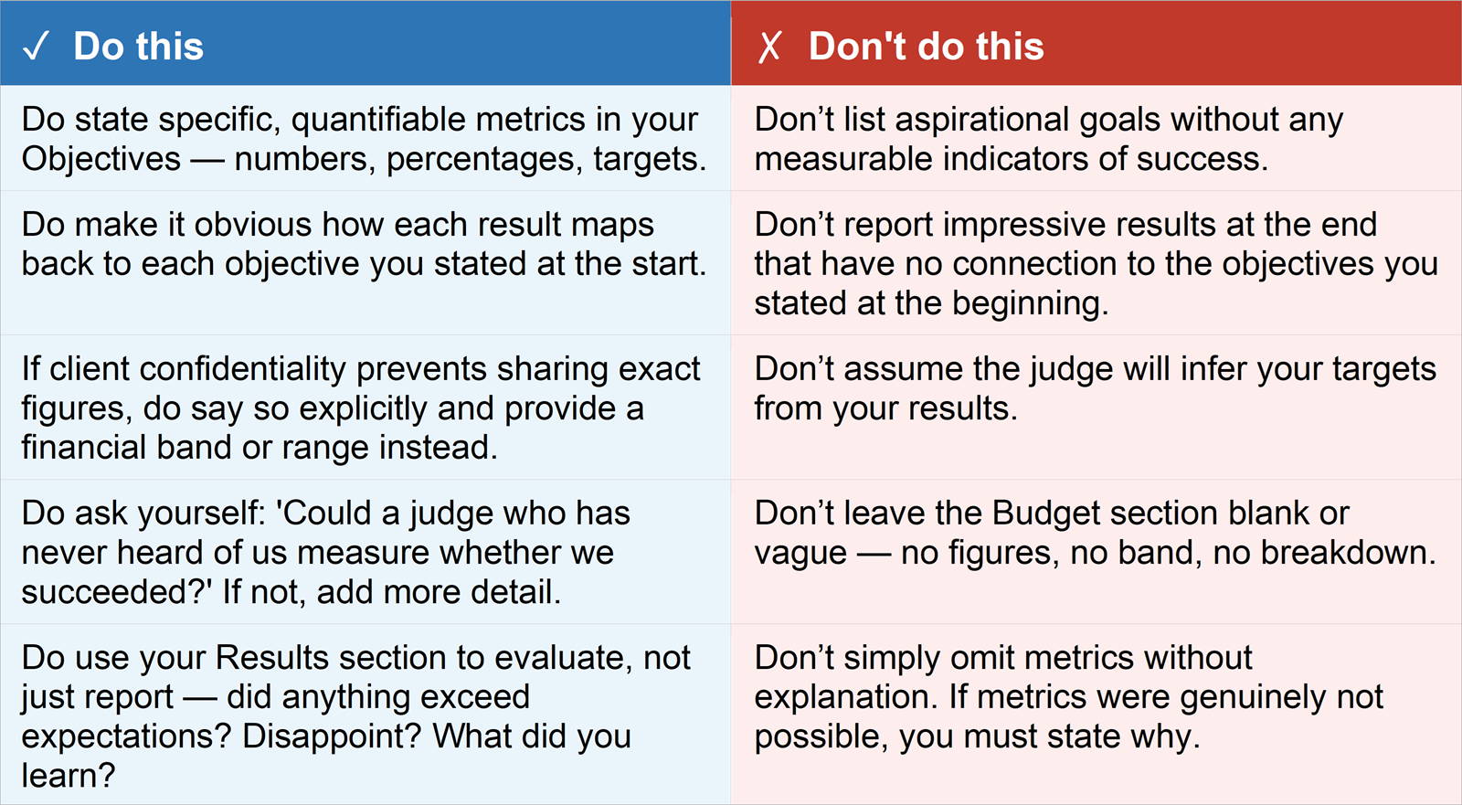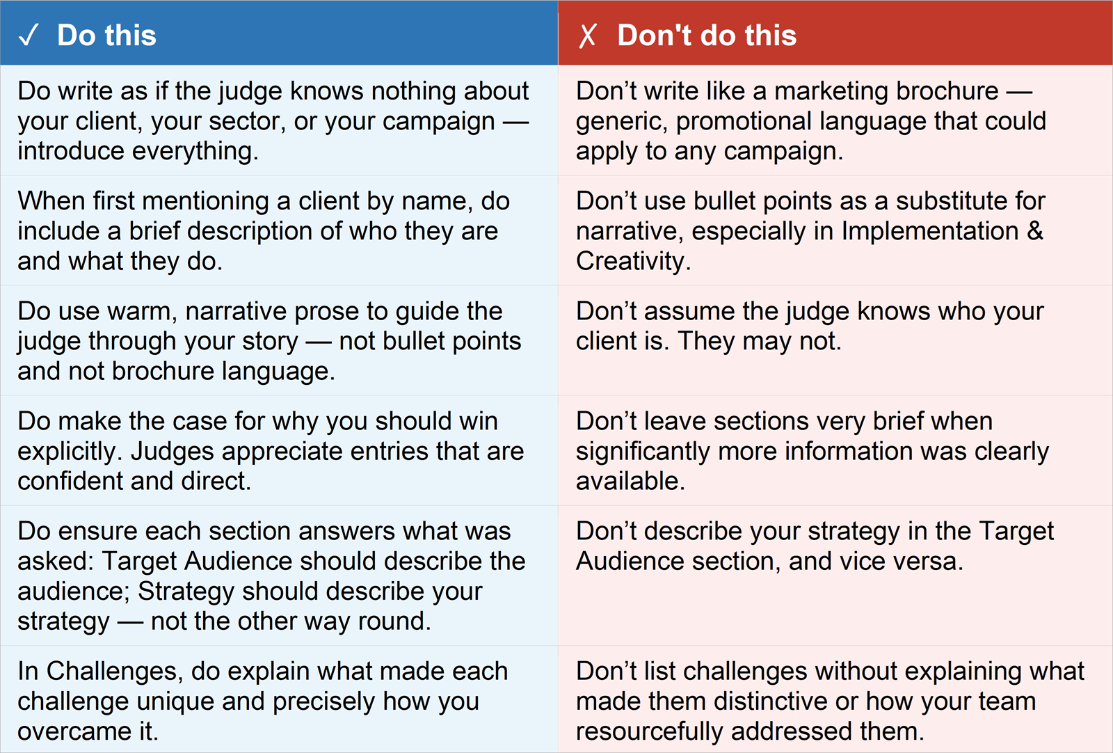 Two related issues appear repeatedly: entries that assume the judge has expert knowledge of the client or industry, and entries where individual sections are so brief that they fail to convey the full picture. If you have more to say – and you almost certainly do – say it.