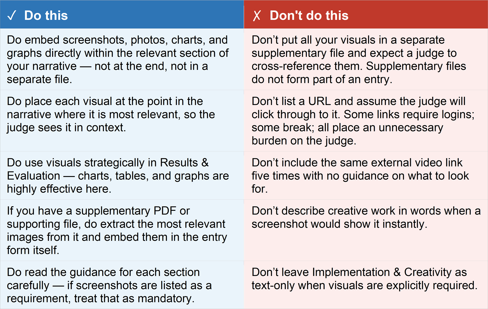 This is the most operationally fixable issue in award entries – and yet it appears with remarkable consistency. The guidance for Implementation & Creativity explicitly requires screenshots to be embedded within the narrative. Many entrants either ignore this, place visuals in supplementary files (which do not form part of an entry), or list URLs and expect the judge to go and look.