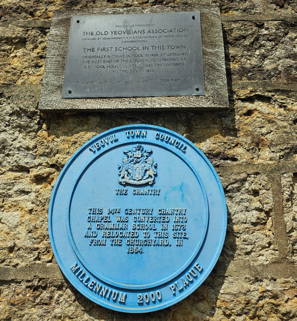 The top plaque, installed in 1977, commemorates Yeovil’s first school, originally a choir school dating back to 1401. It was refurbished as a schoolhouse in 1573 and moved to this spot in 1855. The second plaque, added for the Millennium, notes that the building – The Chantry – was once a 14th-century chapel, later converted into a grammar school.