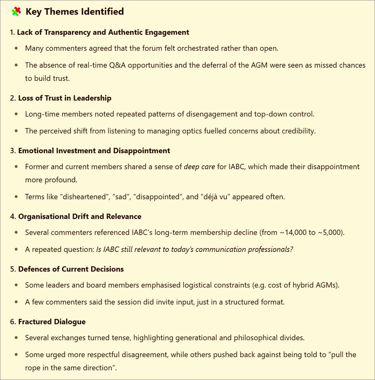 According to an analysis of anonymised comments (names removed) I asked ChatGPT Plus to carry out, there is concern that IABC is no longer listening. That opportunities for real engagement are being replaced with stage-managed sessions. That tough questions are avoided, not embraced.
