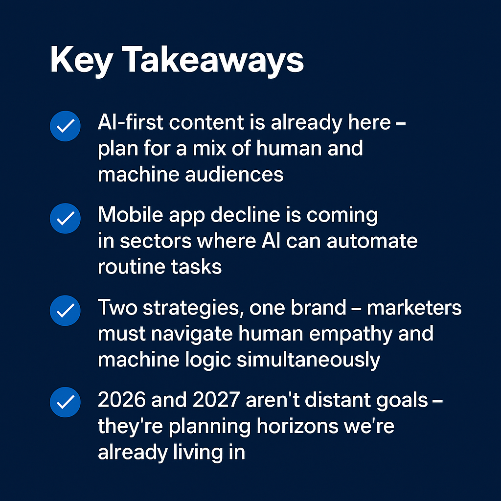 For marketers, this means designing not just app journeys, but AI-accessible endpoints — APIs, structured data, and content ready to be actioned by a virtual agent.
