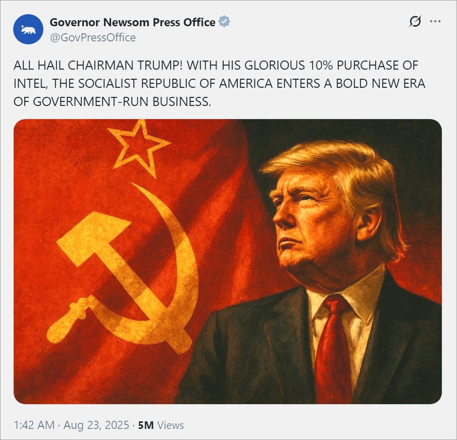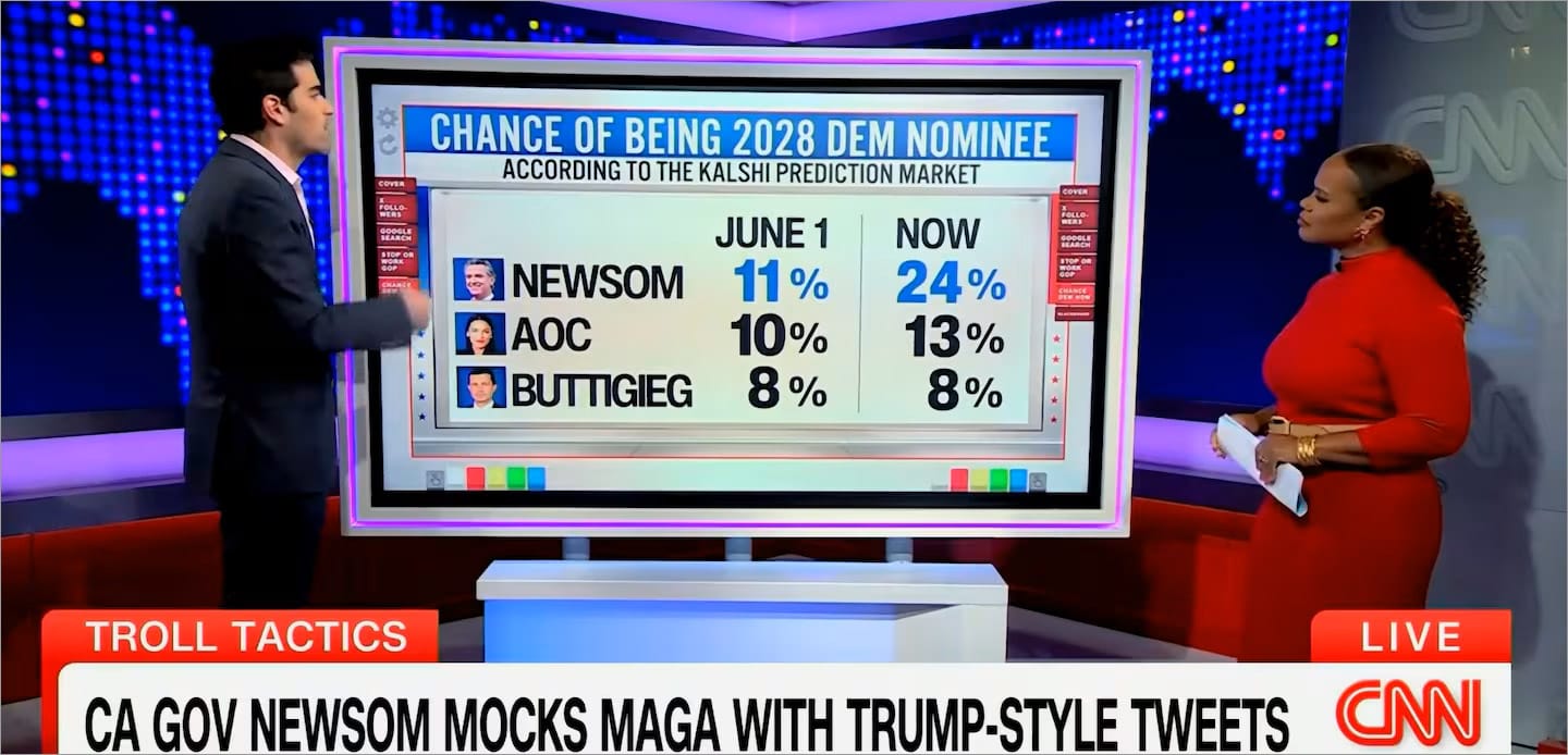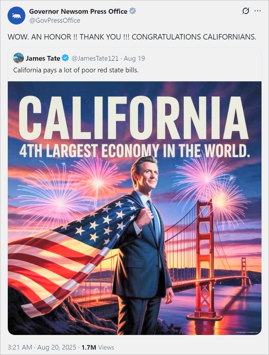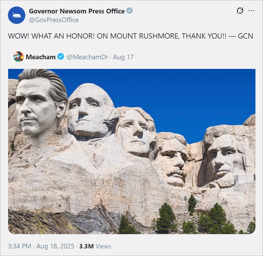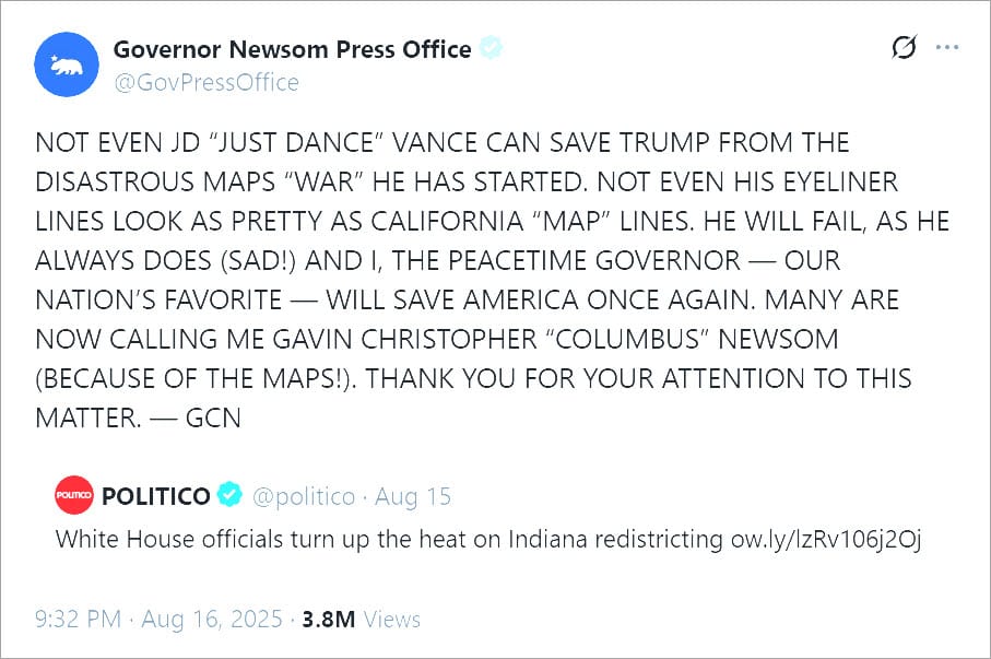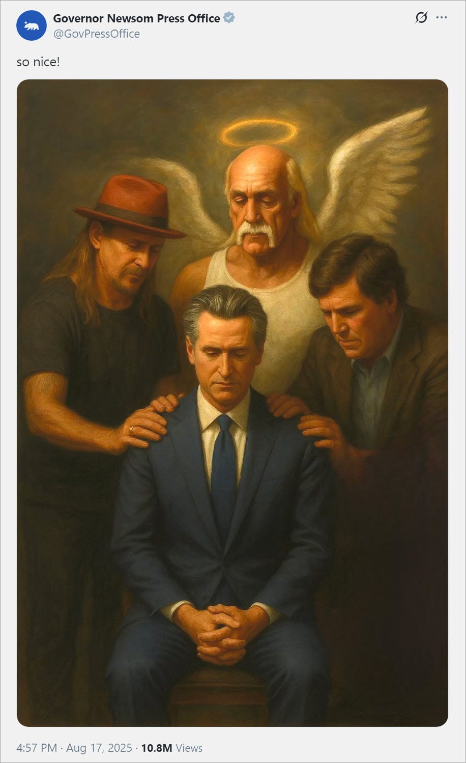 Memes won’t win elections on their own (see Harris, above), but they shape the narrative. They frame how people talk, recall, and feel long before campaigns even begin. In that realm, Newsom is commanding the stage, and it looks like he's in a very good place for when the assessment for candidates to run for the Democrats in 2028 gets underway.